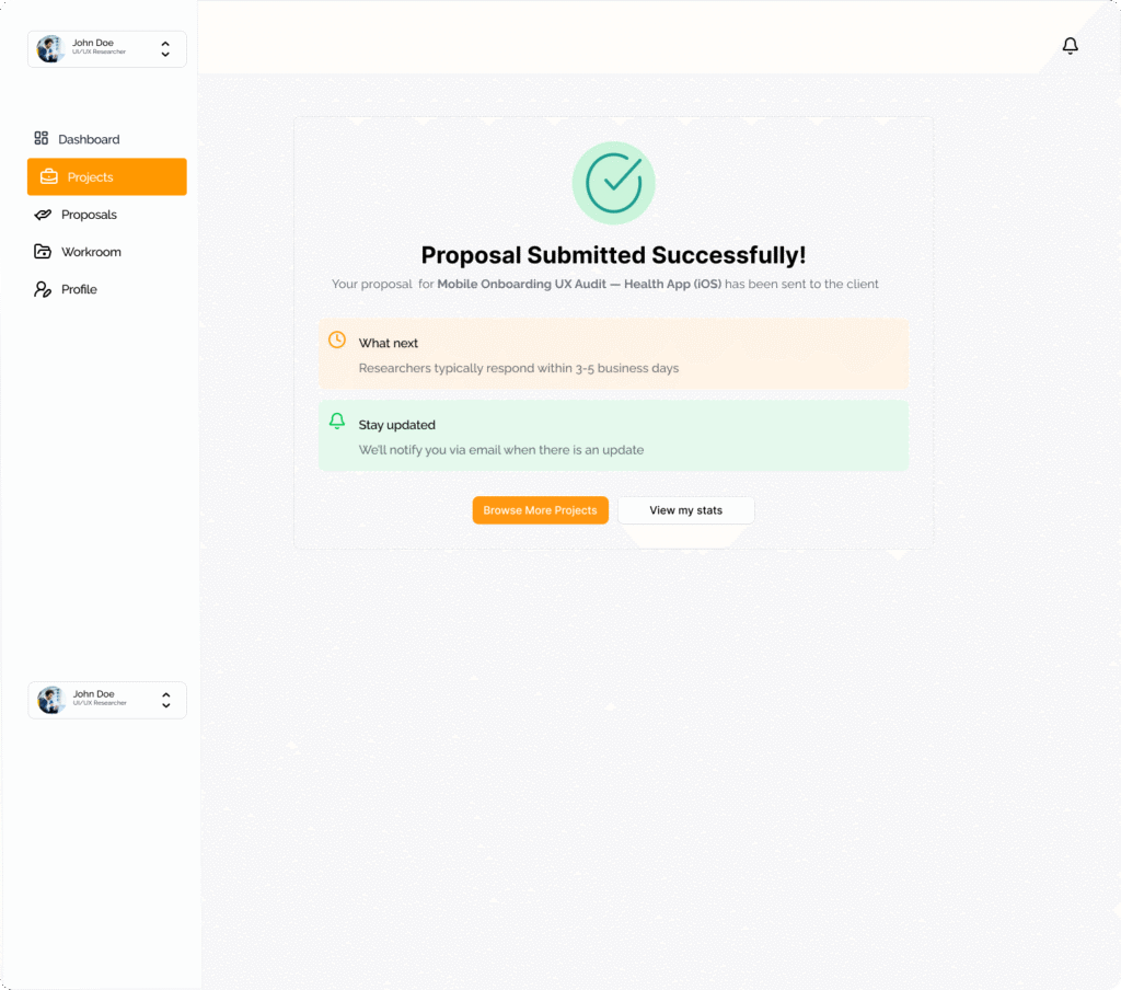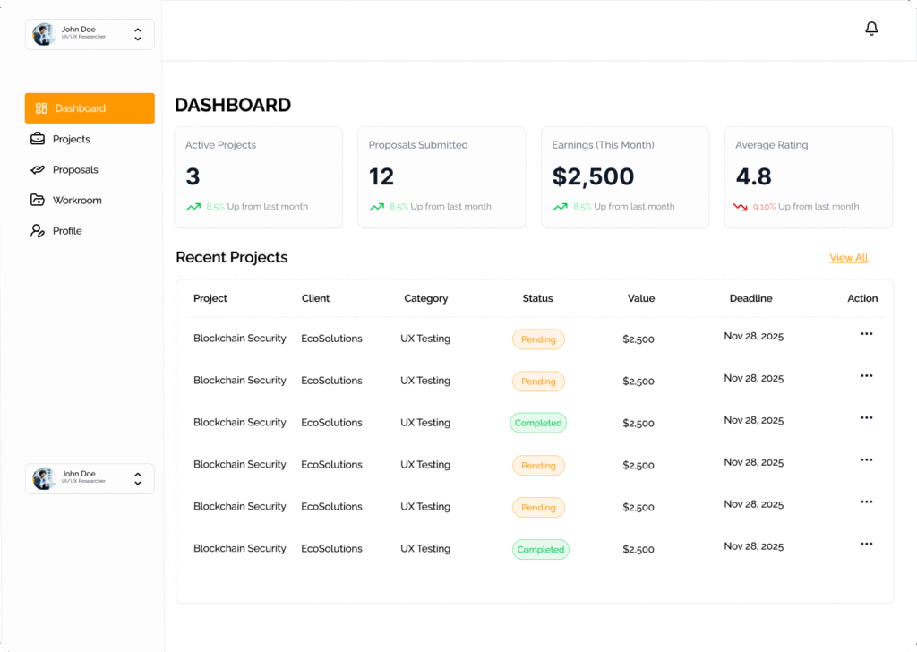 A structured dashboard, guided onboarding, and clear visual hierarchy help users navigate tasks such as project creation, proposal reviews, and managing work submissions.