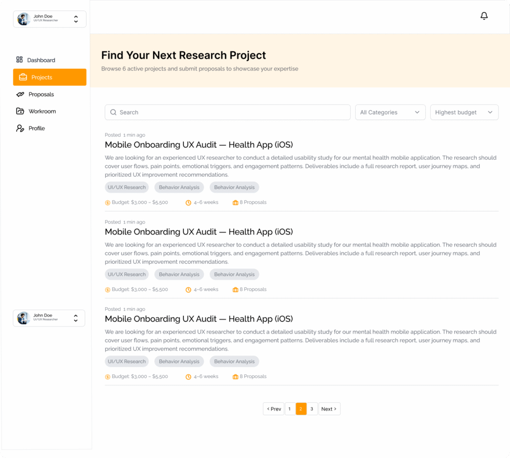 The “Research Marketplace Platform” needed to solve the complexity around onboarding, project posting, researcher verification, communication, and safe work delivery—especially for users unfamiliar with digital tools.